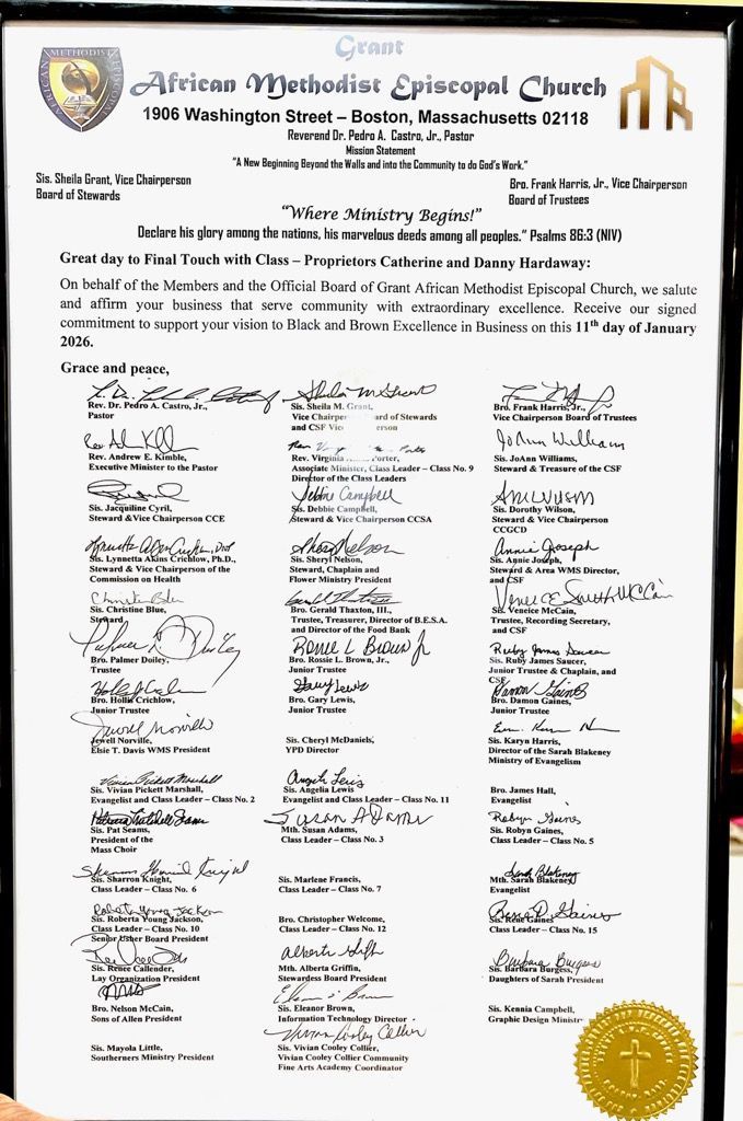 The Grant African Methodist Episcopal Church has awarded Final Touch Boutique, acknowledging how we serve in the community.